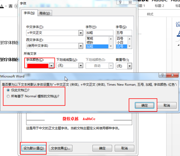 在word文档中,单击右键,选择“字体”,在选项卡中根据需要作相应选择,比如将字体颜色设置为红色。然后单击“设为默认值”,即可将文档的字体设置为用户修改的样式。如果选择“仅此文档”,那么所作修改,只有本文档才有效。如图所示。