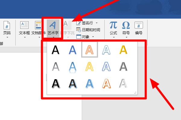1、新建word文档,点击顶部菜单栏上的“插入”按钮,然后点击工具栏上的“艺术字”按钮在文档中插入艺术字:
