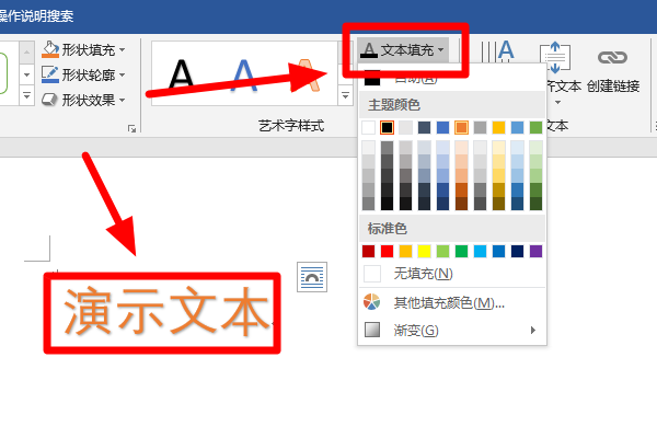 2、将插入的艺术字选中,然后点击工具栏上的“文本填充”按钮,在展开的列表中选择想要渐变的颜色: