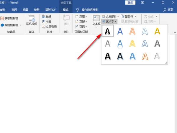 2、然后我们点击打开“艺术字”后面的倒三角形,选择一种艺术字。