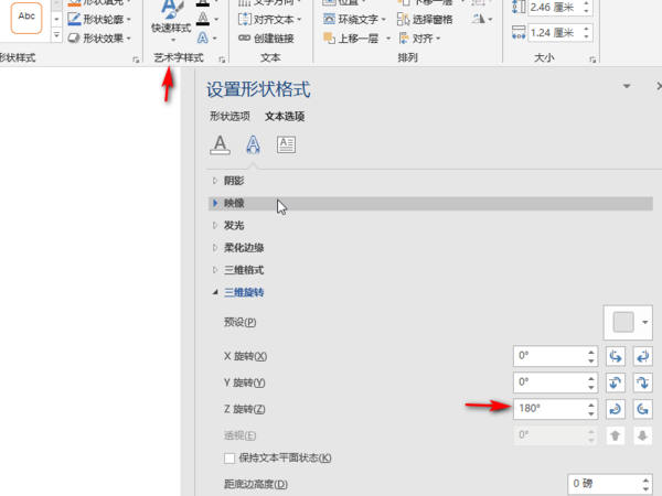 3、然后我们点击打开“艺术字样式”后面的箭头,在旋转输入框中输入“180”即可。