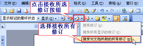 3、点击审阅工具条里的“接收所选修订”按钮,再选择“接收对文档所做的所有修订”,去掉WORD修订痕迹。
