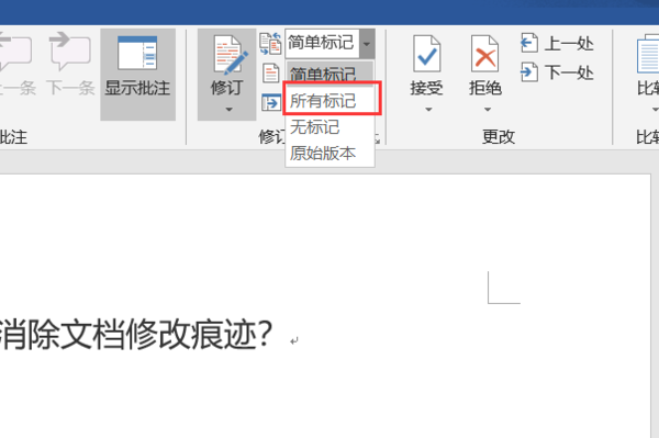 6、word默认是简单标记,在修订旁边的框选择所有标记: