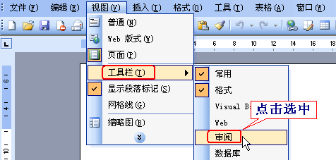 2、点击“视图”-“工具栏”,将“审阅”挑上勾,调出审阅工具条如下图: