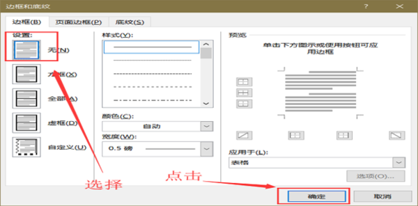 8,在“边框和底纹”窗口,点击如图位置,将外框去掉。