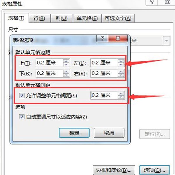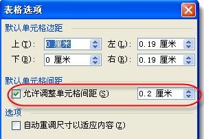 5,在“表格选项”窗口中选择“允许调整单元格间距”,根据实际情况设置数值如0.2厘米。