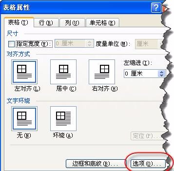 4,在“表格属性”窗口中点击下方的“选项”按钮。