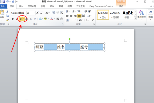 2、选中相应的班级、姓名、座号后面空格,然后点击字体选项上的“下划线”添加下划线。