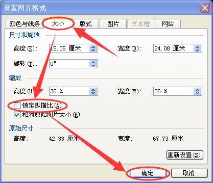 3、在【设置图片格式】对话框【大小】标签页下,将“锁定纵横比”前面的勾取消掉,然后点击“确定”。