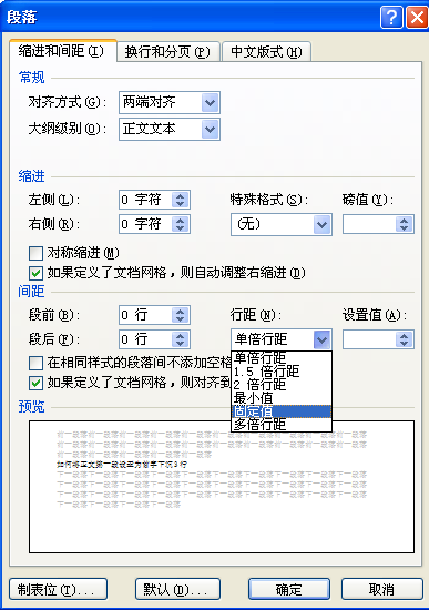 如果选择“固定值”的话,还可以通过“设置值”编辑框设置具体的行距值。设置完毕单击“确定”按钮即可。