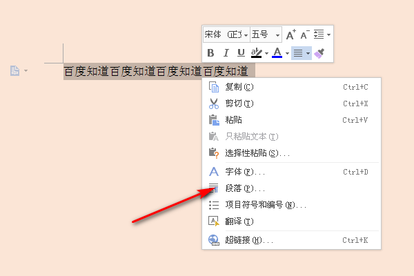 1、选中需要调整行间距的文本;单击鼠标右键,在弹出的快捷菜单中选择段落命令;