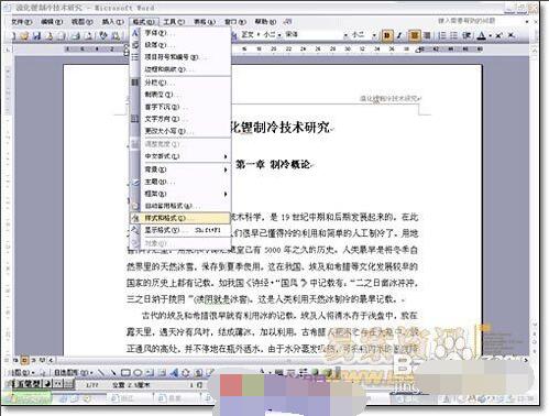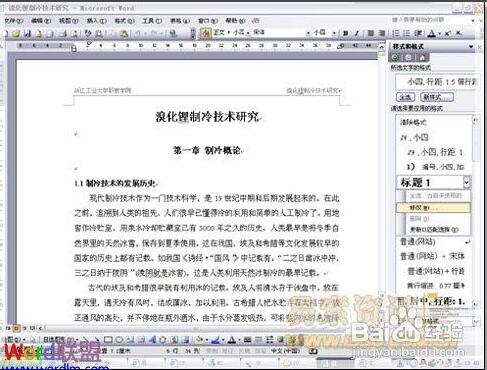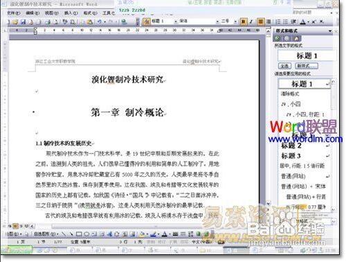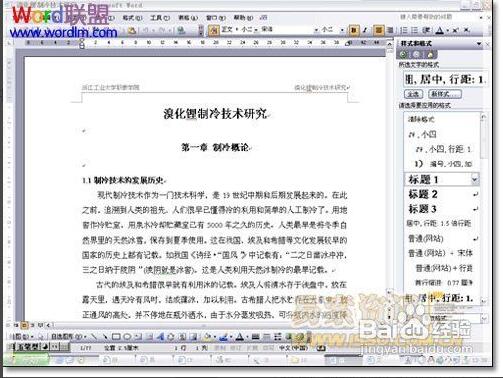 2.出现右边的一条“样式格式”栏,这里面主要就是用到标题1,标题2,标题3。把标题1,标题2,标题3分别应用到文中各个章节的标题上。例如:文中的“第一章 制冷概论”我们就需要用标题1定义。而“1.1制冷技术的发展历史”就用标题2定义。如果有1.1.1×××那就用标题3来定义。