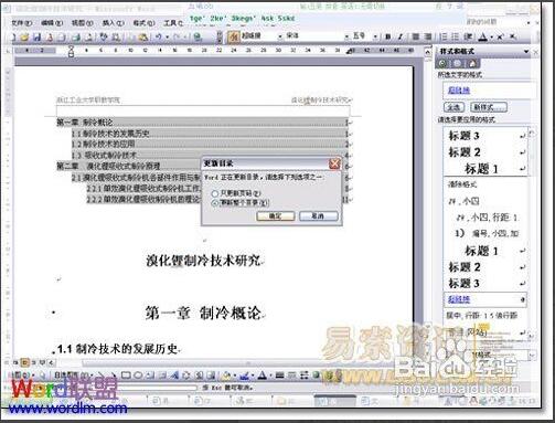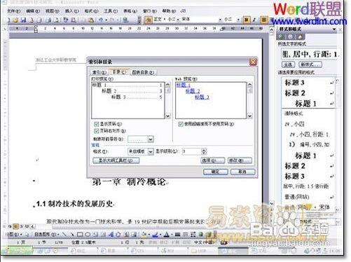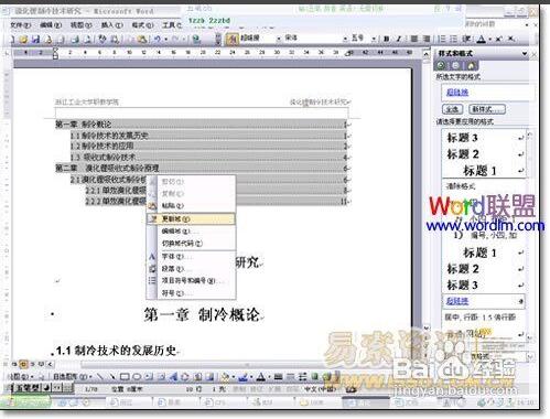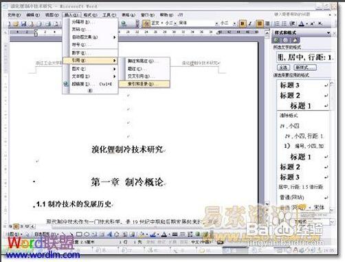 4.用标题1,2,3分别去定义文中的每一章节。定义时很方便,只要把光标点到“第一章 制冷概论”上,然后用鼠标左键点一下右边的标题1,就定义好了;同样方法用标题2,3定义1.1;1.1.1;依此类推,第二章,第三章也这样定义,直到全文节尾。