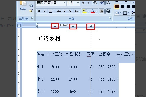 6、对第二列以及后面几列的数字用同样的方式拖动标尺进行对齐。最后的文字效果如图。这时我们对某个文字进行修改,其他文字的位置是不变的。