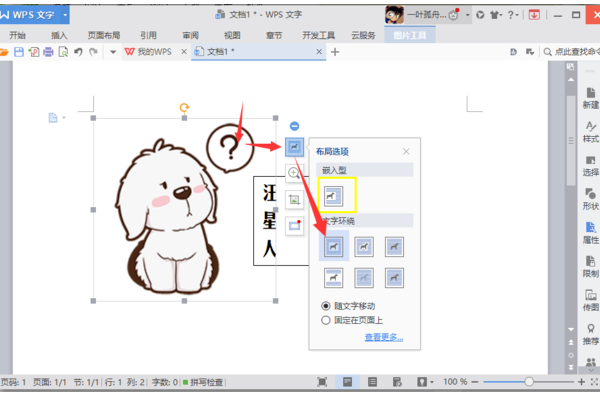 3、点击图片,右侧会弹出一个快捷键工具,选项布局选项,将布局选项设置为“四周型”。
