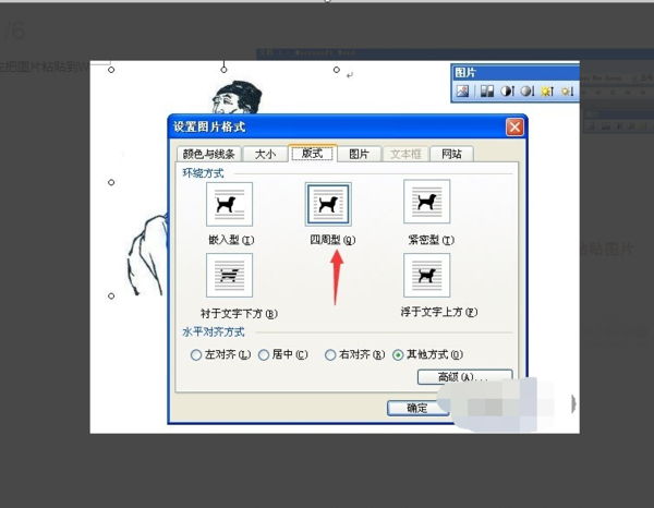 3、双击图片,弹出对话框“设置对象格式”,原来默认的是“嵌入型”,我们把它改为“四周型”