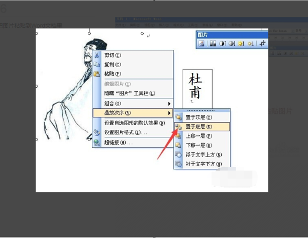 4、在图片上点击右键,选择置于底层,置于底层(防止图片覆盖文本框)。