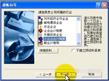 2、在对话框中输入账套名称,点击下一步,并在对话框中选择公司所属行业,选择完成后点击下一步,选择记账本位币,默认为人民币,可根据公司情况自行选择。