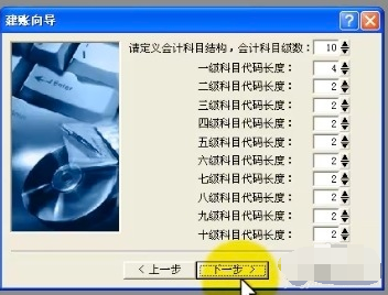 3、选择会计科目的长度对话框中根据企业业务需要、记账习惯进行会计科目长度的设定,此设定后期不能更改,需要根据实际使用情况设定。