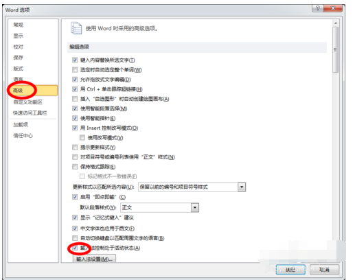 2)word2007:word左上角office菜单-word选项-高级-不要勾选‘输入法控制处于活动状态’→确定。关闭word,重新打开。