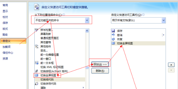 2.弹出“Word选项”对话框,在左侧的下拉列表中选择“不在功能区中的命令”,拖动滚动条选择“切换全屏视图”命令,单击“添加”按钮将其添加到右侧区域中。