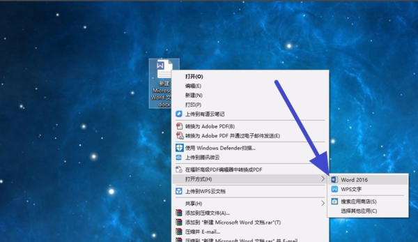 1、创建一个文档,然后点击鼠标右键选择使用word 2016打开