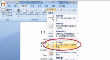 2、我们点击“页面布局——(页面设置)分隔符——(分节符)下一页”。