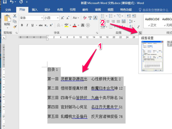 2、首先选中所有的目录,然后按照下图中红色箭头步骤2点击【段落设置】