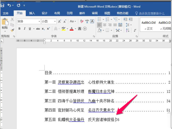 5、然后回到之前的目录中,将光标放置在页码前,然后点击【tab】键就会自动对齐页码了