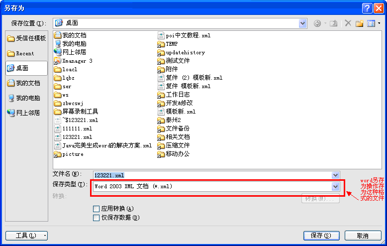 java有什么方法将word文件转换为Word XML格式的文件 就是word另存为时,可以选择另存为Word XML的格式