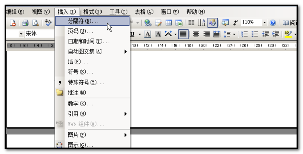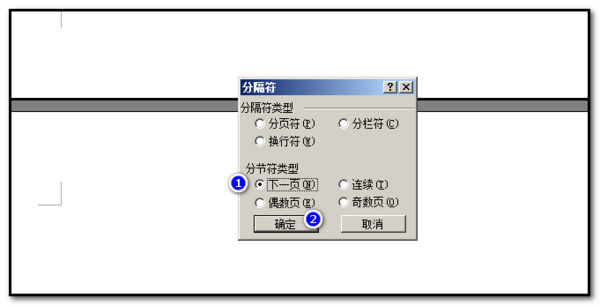 ②“插入---分隔符”,在“分节符类型”选项中,选择“下一页”,单击“确定”;