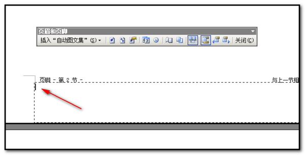 ⑥ 单击“页眉和页脚”工具栏上“链接到前一个”按钮,页脚区域显示的“与上一节相同”的提示就消失了;