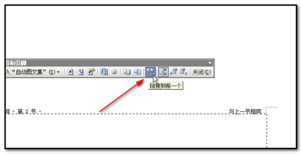 7;然后,再在“页眉和页脚”操作框中点下“链接到前一个”按钮;