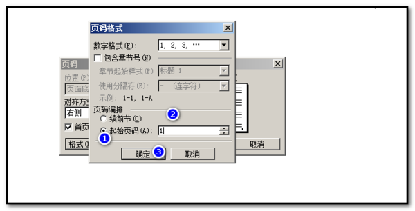 ④ 按“格式”键,复选“起始页码”,选择“1”,单击“确定”。