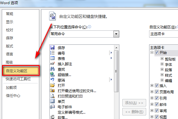 3、在【自定义功能区】中,找到【键盘快捷方式】,选择【自定义】;