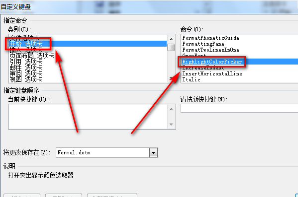 4、在【自定义】选项类别中选择【开始选项卡】,命令中选择【HighlightColorPicker】;