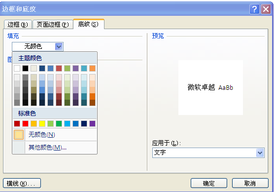 3、弹出边框和底纹对话框,选择底纹选项卡,在填充处选择一种所需要的颜色即可,如图所示。