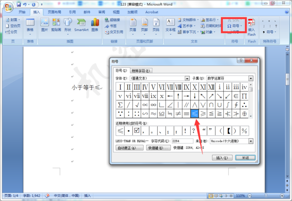 在WORD中小于等于号如何打