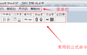4、可以看到公式编辑器最上面的是菜单栏,在菜单栏下面是常用的公式命令。