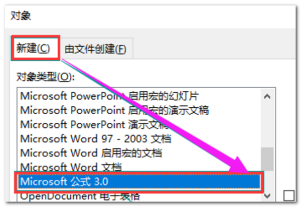 3、打开“对象”对话框,在“新建”选项卡下的对象类型列表中选择“Microsoft 公式 3.0”项目,单击“确定”按钮。