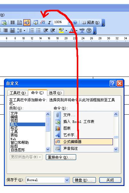 3、选中“公式编辑器”,按住鼠标左键,将其拖拽到Word常用工具栏中。以后当需要用到“公式编辑器”的时候,直接在常用工具栏中点击它即可。