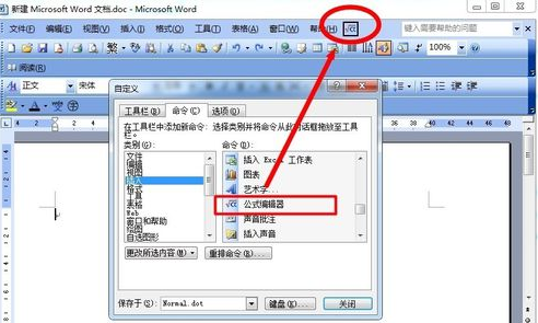 2、在随后打开的【自定义】对话框中,选择【命令】选项卡,先选择左边“类别”中的插入,在右面的“命令”中就可以找到公式编辑器了。