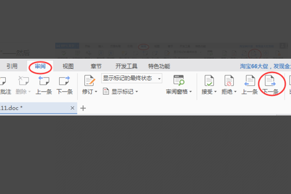 1、首此案我们打开电脑里的word文档,在菜单栏上选择 “审阅”选项,再点击 “下一条”选项。