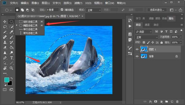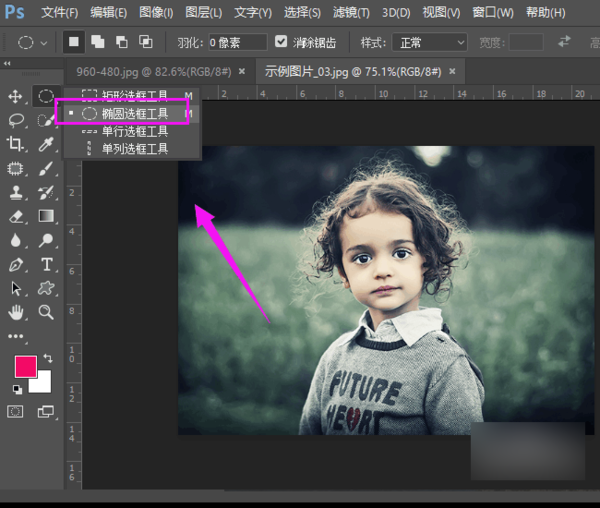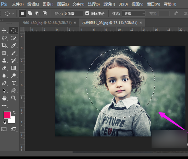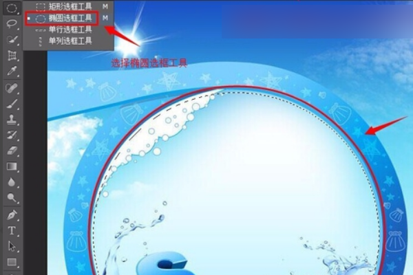 3、接下来在左边工具栏中选择红色箭头所指处的“椭圆选框工具”,然后按住shift键在图片上画出圆形选区。