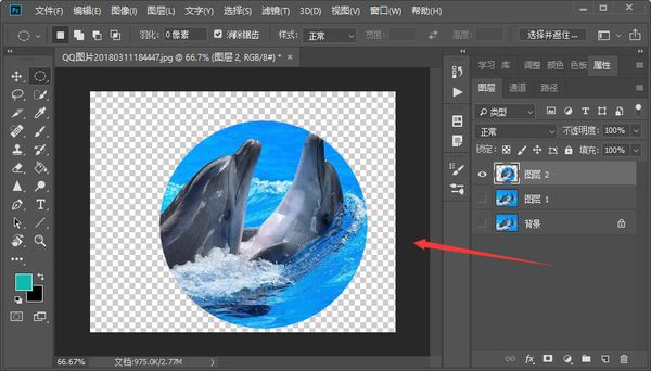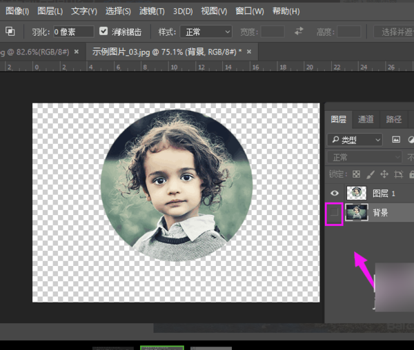 5、最后将背景图层删除掉或者隐藏掉,就裁剪出来了一个圆形的图片,将图片保存就好了。完成以上设置后,即可用PS将一张图片裁剪成圆形。