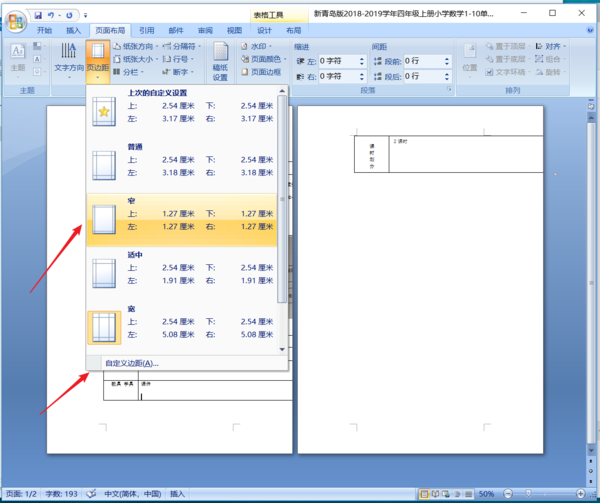 2、在页边距的下拉菜单中,我们点击“窄”,或者点击“自定义边距”,选择设置较窄的页边距。