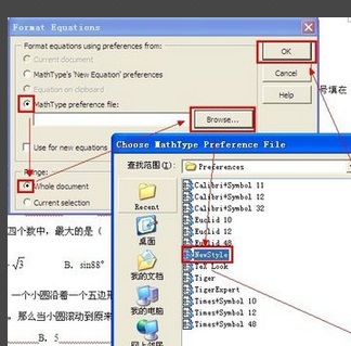 在“Format Equations”对话框选中中间的“MathType preference file”单选项,再选中下方“Range”项目中“Wholedocument”单选项,单击“Browse”按钮,找到我们保存好的那个NewStyle.eqp文件并双击。然后最后单击Ok: