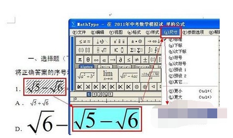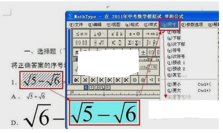 双击要修改的公式,打开MathType的编辑窗口。选择公式之后,依次单击“尺寸,重新定义”: