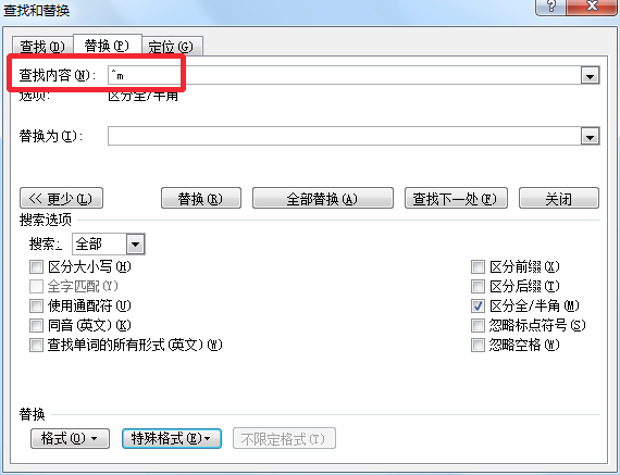 这时候就在“查找内容”中,出现了一个“^m”,当然,下次熟悉了,直接在“查找内容中输入“^m”即可,不需要点击“特殊格式了”,最后点击“全部替换”,如果只想替换部分,就点击“替换”,一个个地替换。