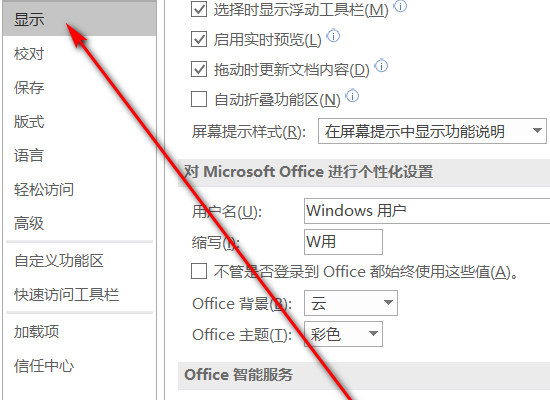 4、在随后打开的“Word选项”窗口,在左侧点击“显示”选项卡。